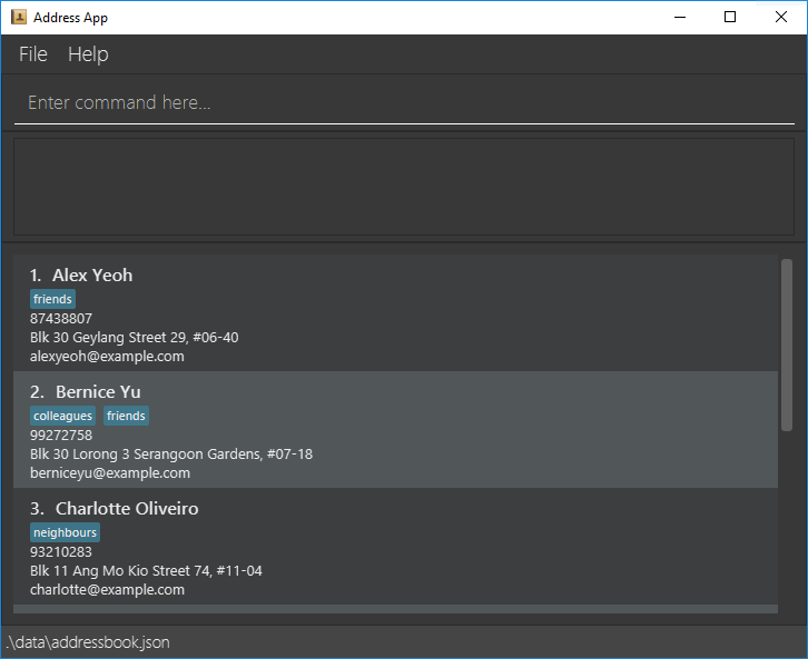 Caution: If your changes to the data file makes its format invalid, AddressBook will discard all data and start with an empty data file at the next run. Hence, it is recommended to take a backup of the file before editing it.